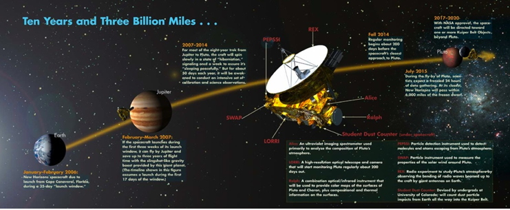 盡管“新視野”號是專門針對冥王星系統設計的探測器,但它的任務不僅于此。之前,它對木星及其衛星作了4個月的詳細觀測。飛掠冥王星之后,它將繼續飛向下一個科學目標——柯衣伯帶(Kuiper Belt)——太陽系的一個神秘未知領域,其間充斥著彗星、小行星和冰凍的矮行星。預計在2029年“新視野”號完成橫穿太陽系的旅程,飛離太陽系。