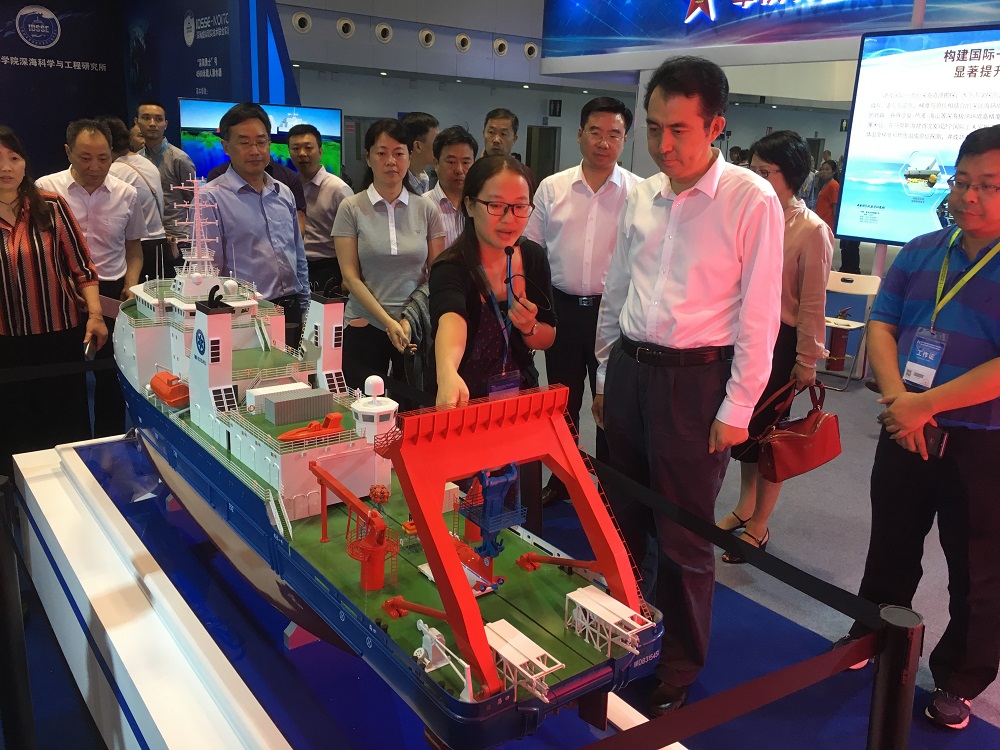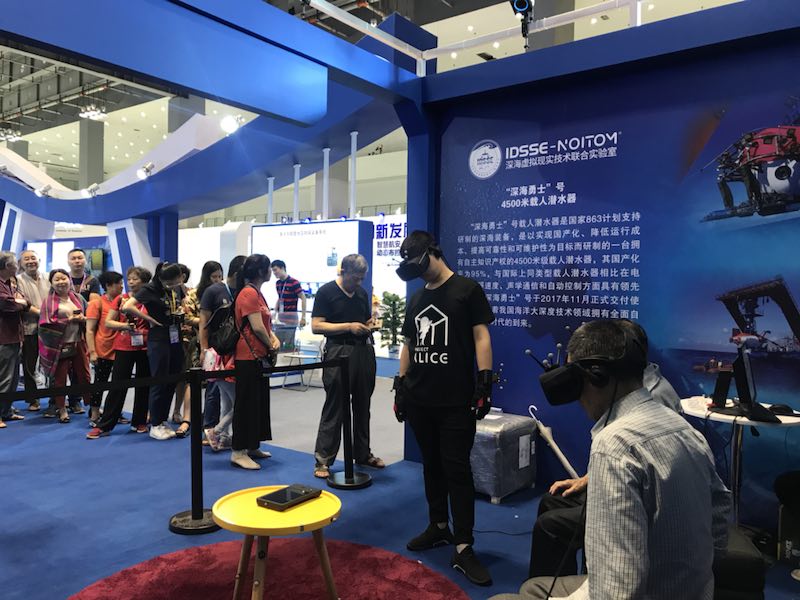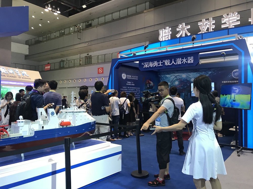 為深入貫徹軍民融合發展戰略,促進軍民融合產業創新發展,中國科學院深海科學與工程研究所應科學技術部的邀請,參加此次展會。深海所展出了“探索一號”科考船及其搭載的深海儀器設備模型,以視頻形式向大眾展示了中科院深淵科考隊“探索一號”到馬里亞納海溝挑戰者深淵開展深淵科考的情況。并利用虛擬現實技術(VR)多維解析了我國擁有自主知識產權的載人潛水器“深海勇士”號的結構原理,通過VR場景模擬讓觀眾親身體驗乘坐“深海勇士”號潛入深海進行科考作業的場景。
