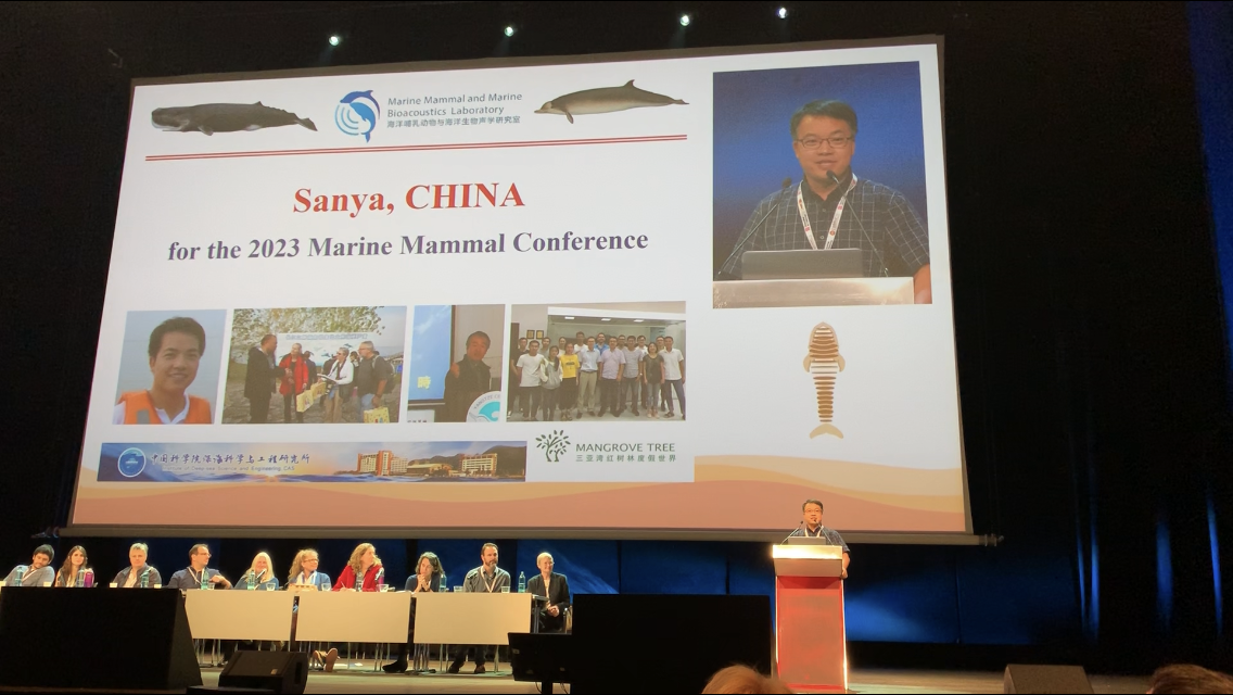 1210日晚,李松海研究員在大會主會場為申請三亞作為2023年世界海洋哺乳動物雙年會主辦地進行了口頭報告,介紹了三亞獨特的地理位置、承辦會議條件及南海獨特的鯨類資源分布情況。本次競爭主辦權的城市還包括新加坡和澳大利亞珀斯
