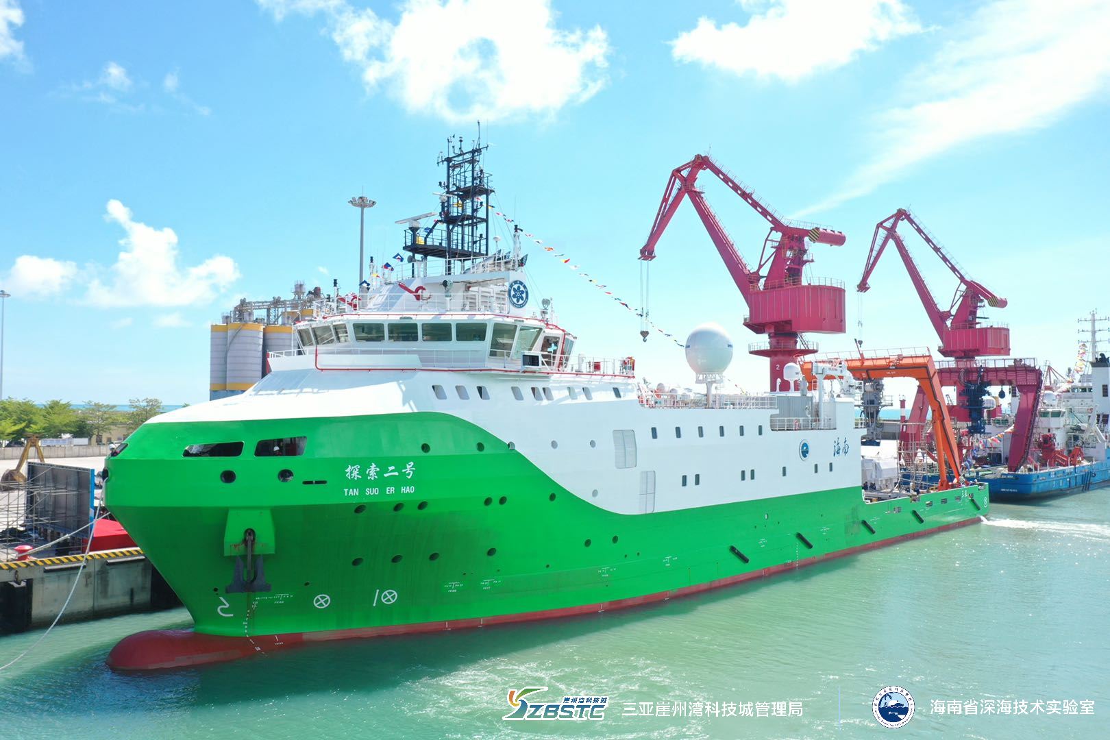 625, “探索二號”船從福建馬尾造船廠碼頭啟航,經(jīng)過830海里的航程, 28日下午,順利抵達(dá)三亞崖州灣科技城南山港碼頭。來自海南省人民政府、海南省科學(xué)技術(shù)廳、深圳市規(guī)劃和自然資源局、中國船舶集團(tuán)702研究所、704研究所、武漢理工大學(xué)、中科院沈陽自動(dòng)化所、中科院聲學(xué)研究所、三亞崖州灣科技城管理局等相關(guān)單位代表共200余人參加接船儀式。