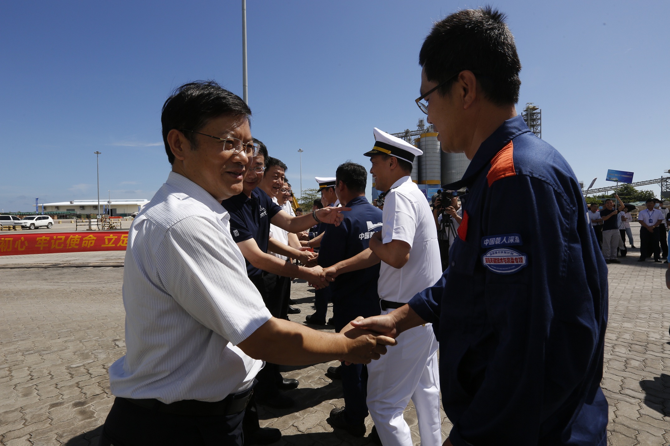 當(dāng)天下午,驕陽似火,“探索二號”船搭載著60名參加首航的科考隊(duì)員順利返航,遠(yuǎn)遠(yuǎn)看去,船舶右舷橫掛著兩條巨型橫幅——“砥礪探索 不懈奮斗 勠力開創(chuàng)中國深海科技新征程”;“三亞,你好,我回家了!”,橫幅內(nèi)容振奮人心、充滿溫情,首次亮相的“探索二號”船緩緩駛?cè)肽仙礁鄞a頭,下午3點(diǎn)整,準(zhǔn)時(shí)停靠,參航人員依次從甲板下船,和接船來賓一一握手擁抱,場面感人。