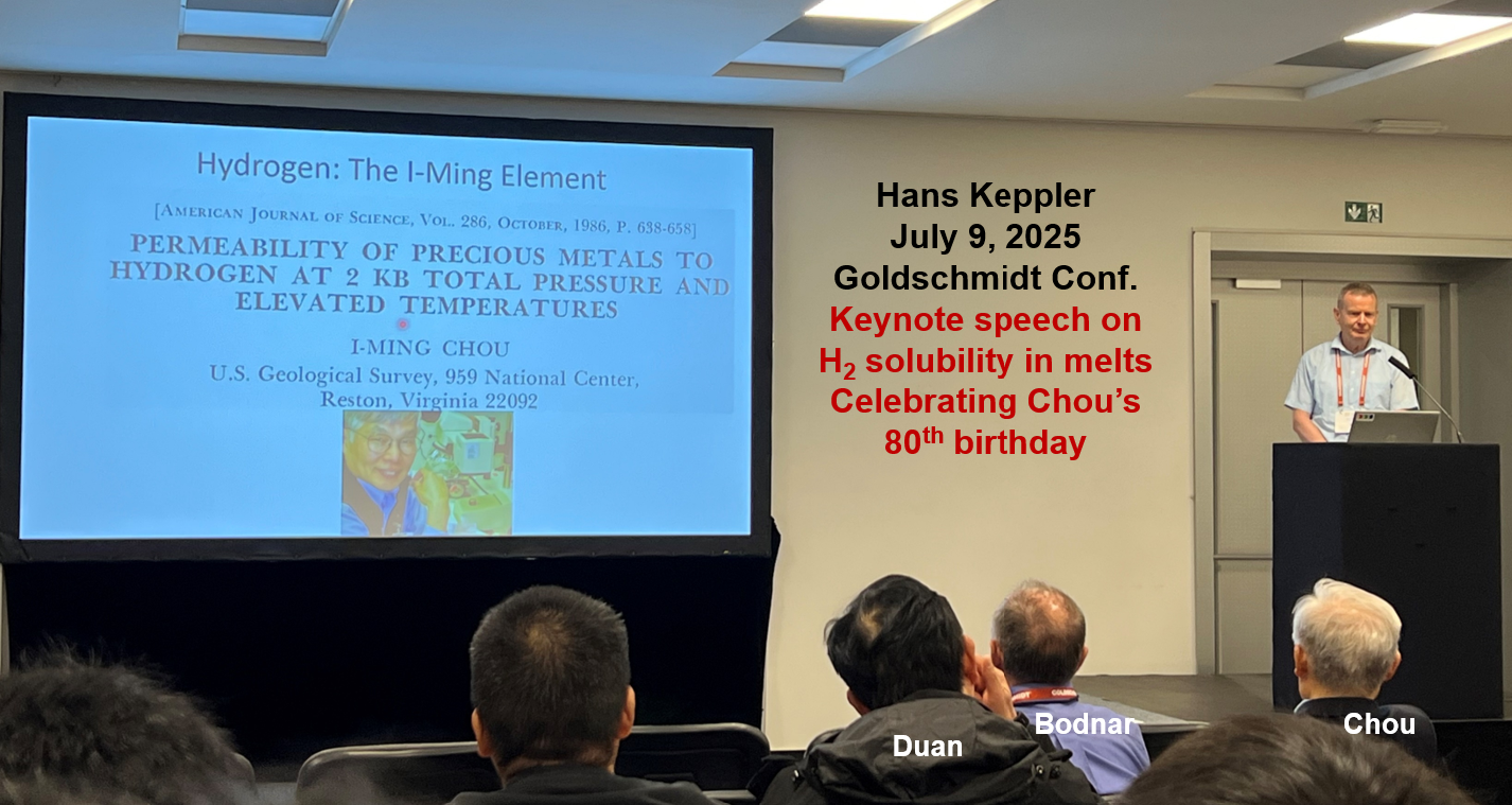 本屆大會(huì)參會(huì)人數(shù)規(guī)模達(dá)到4400人,還特別設(shè)立了專題分會(huì)(Session 02n)。該專題分會(huì)由六位國(guó)內(nèi)外學(xué)者共同發(fā)起,共收到50余份摘要,旨在致敬我所周義明研究員在實(shí)驗(yàn)地球化學(xué)領(lǐng)域做出的卓越貢獻(xiàn)。德國(guó)拜伊羅特大學(xué)高壓實(shí)驗(yàn)中心(Bayerisches Geoinstitut)原所長(zhǎng)Hans Keppler教授在主旨報(bào)告中將氫稱之為“I-Ming Element”,高度評(píng)價(jià)了周義明研究員在高溫高壓實(shí)驗(yàn)中氧逸度控制與測(cè)量技術(shù)上的引領(lǐng)貢獻(xiàn)。特邀報(bào)告人包括美國(guó)國(guó)家科學(xué)院院士、弗吉尼亞理工大學(xué)Robert Bodnar教授,德國(guó)地球科學(xué)研究中心(GFZ)Christian Schmidt教授,以及巴黎地球物理研究所(IPGP)Razvan Caracas研究員。這一專題不僅彰顯了周義明研究員在國(guó)際地球科學(xué)界的學(xué)術(shù)影響力,也為與會(huì)者提供了一個(gè)深入探討礦物學(xué)、礦床學(xué)、巖石學(xué)以及深海科學(xué)等領(lǐng)域最新進(jìn)展與未來方向的重要平臺(tái),進(jìn)一步促進(jìn)跨學(xué)科的合作與交流。