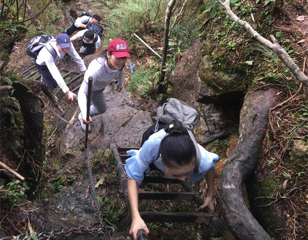 當天上午10:30分,參加活動的成員抵達五指山自然保護區,分成四個小分隊開始登山。其中第一分隊一馬當先,追溯昌化江源頭路線最先抵達;第三和第四分隊也按計劃登山,沿途感受著熱帶雨林的瀑布潺潺和林木蒼翠;第二小分隊,目標直指五指山頂峰,經過木棧道后,沿著盤根錯節的原始小徑和幾乎垂直的鐵梯,手腳并用一路攀爬,登上了云霧繚繞的五指山一峰,隨后一鼓作氣,登上了最高峰——海拔1867米的二峰。