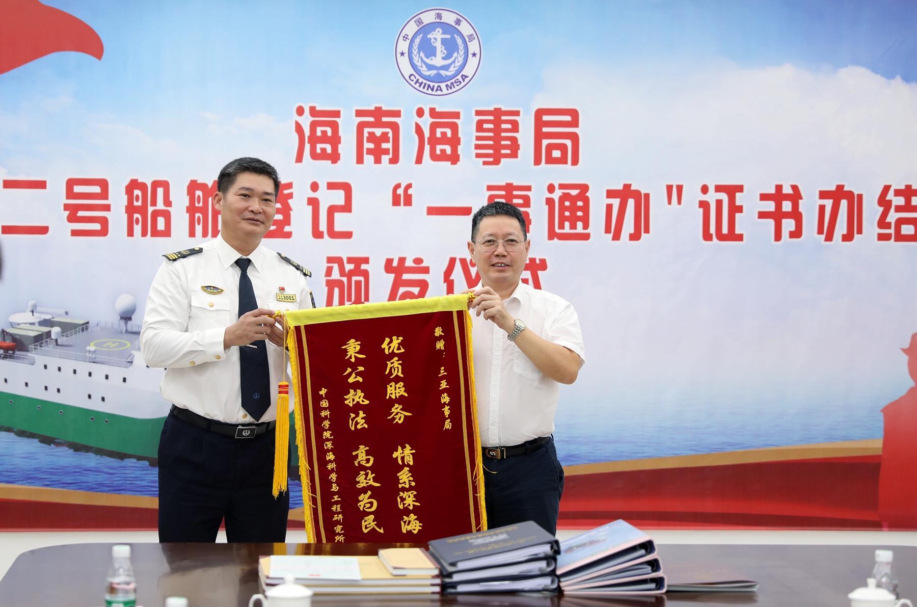 深海所“探索二號(hào)”科考船在海南獲得“身份”證明