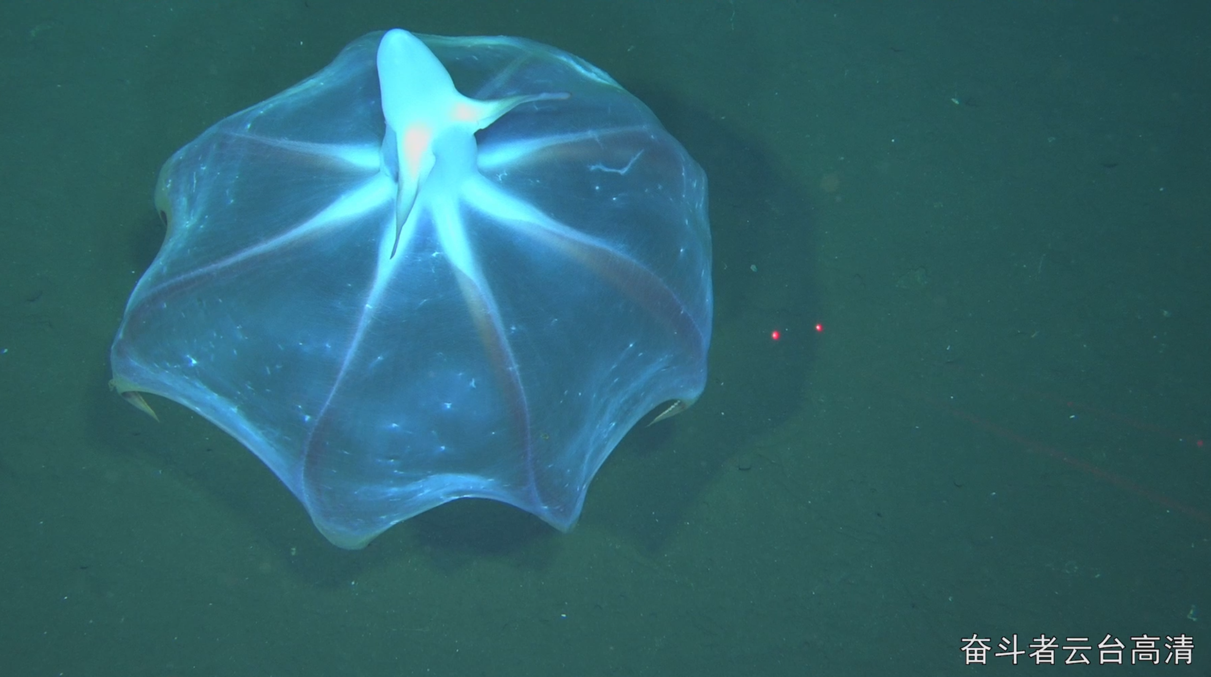 2月8日,“奮斗者”號在蒂阿曼蒂那海溝5500米深度發(fā)現(xiàn)飛象章魚