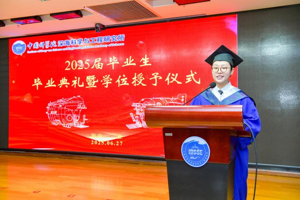 2025年6月27日, 中國科學院深海科學與工程研究所(以下簡稱“深海所”)2025屆研究生畢業典禮暨2024-2025學年優秀學生表彰大會在1003會議室順利舉行。所領導、學位評定委員會委員、研究生導師及人事教育處老師齊聚一堂,共同歡送34名畢業生。會議由崖州灣園區管理部主任張忠主持。