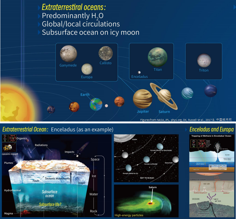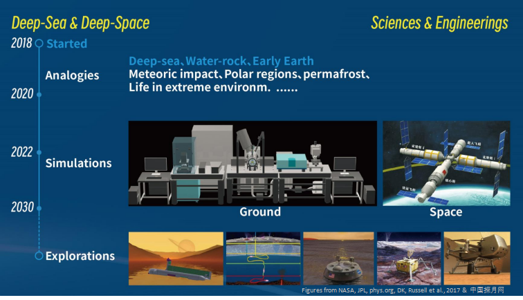 Preservation and detection of biosignatures from deep-sea, deep-space and deep-time; Formation and evolution of extraterrestrial oceans; Potential physical, chemical, and biological processes in extraterrestrial oceans; Prebiotic and abiotic carbon cycling compared with biosignatures; In-situ and real-time analyses in deep-sea and deep-space environments; Exploration for extraterrestrial life and habitable environments for humans.?